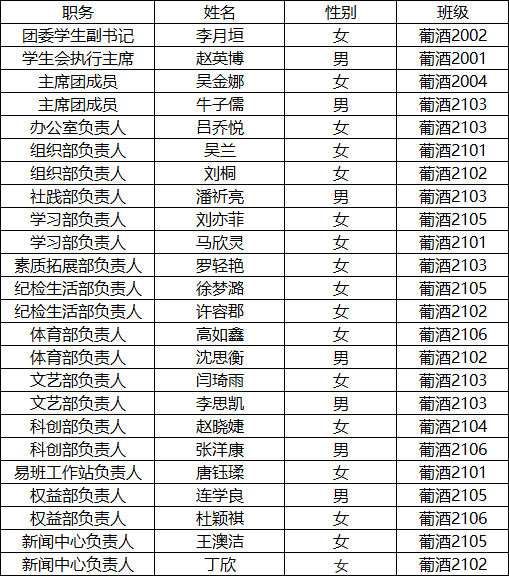 经前期个人申请、学院资格审查、考察约谈、公开竞聘,通过无记名投票差额选举,学院换届工作领导小组研究决定,现将2022-2023学年团委学生会干部名单公示如下: