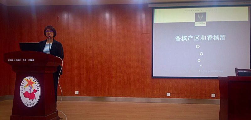 在本次活动中学院特地邀请了王蔚老师担任此次报告会以及品鉴会的主讲人,王蔚老师毕业于北京外国语大学法语系,法律博士,留学法国、爱尔兰。长期从事知识产权法律工作。2006年至今担任法国香槟酒协会中国首席代表。她对香槟的热爱与了解带领同学们从多方面深入了解香槟的故事。