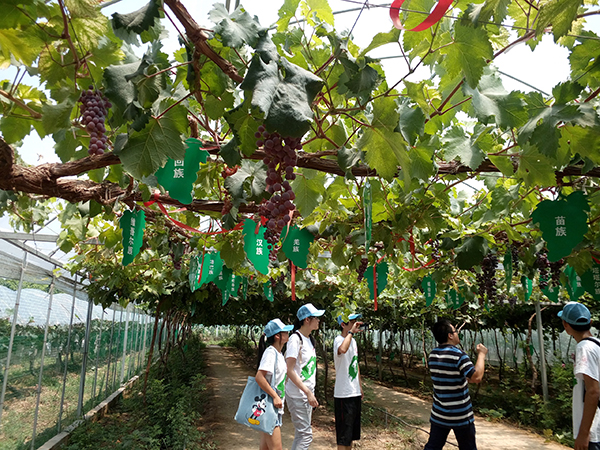 赴渭南葡萄栽培调研服务队顺利抵达渭南市临渭区下吉镇渭北葡萄产业园,开展调研活动。清晨,一行五人带着提前设计好需要向园区工作人员请教的问题来到了渭北葡萄产业园。首先映入眼帘的就是万米葡萄长廊,走在长廊里只觉神清气爽;随后在园区主任和工作人员的带领下,团队成员们初步了解了园区的布局和一些品种葡萄的栽培技术,尤其是葡萄避雨栽培技术。葡萄博览园、采摘园、大棚、观光长廊等园区构成了产业园的总体,这里有各种新品种和新技术,对带动周边村镇葡萄产业的发展起到重要作用。在调研过程中,一位正在田间工作的大姐告诉大家当地葡萄的价格、行情、自家的栽培小妙招等问题。从交谈中,队员们感受到了大姐的热情,也得知近年来葡萄收益日益增长。