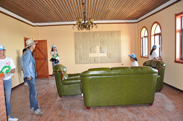三十八度酒庄因地处北纬38度酿造葡萄种植黄金地带而得名。队伍到达时,酒庄主体建筑已竣工,正在进行内部装修工作。酒庄临沙傍水而建,水与沙赋予它静谧和谐,辽阔神秘之美。再加上一望无际,绿意葱茏的葡萄园,更多了几分田园气息。走近酒庄,“甘肃三十八度葡萄酒庄”几个大字字体略显稚拙,李生保师兄介绍说,这也是为了体现酒庄返璞归真的理念。进入酒庄,内部设计古朴典雅,主打黄色暖色调。原木设计,壁柜,家具风格、陈设,甚至灯饰都体现出独特的创意,融汇当地历史文化,带给人灵感和美好。师兄说,酒庄划分了办公、会议活动、展览大厅、住宿接待、中西餐饮、台球娱乐、KTV等多个功能区。依托当地的旅游资源,后期还会有旅游小木屋,房车营地建设。