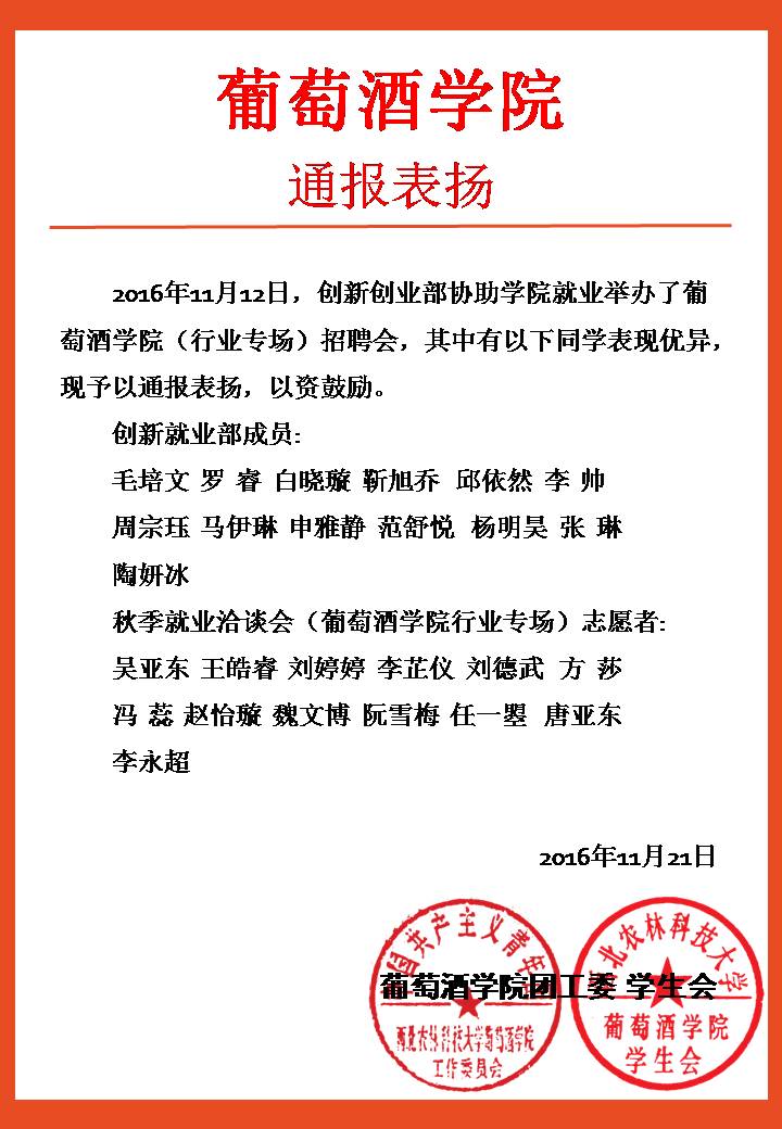 葡萄酒团(2016)40号通报表扬