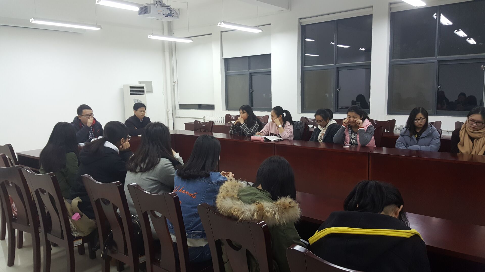 1504班新学期第一次班会在学院会议室顺利召开。班会由15级辅导员赵星宇老师,154班班主任秦义老师主持召开,全体同学共同参加。班会上两位老师带领同学们对上学期进行了回顾总结,同时与同学们深入交流,共同为新学期进行了计划安排。
