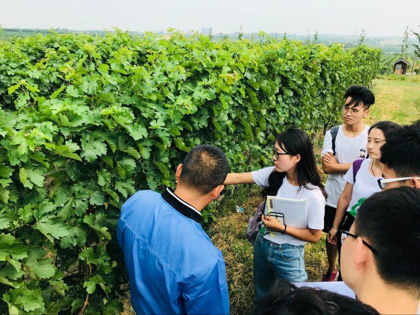 调研队员根据在校田园实习经历向师兄提出了有关修剪、病虫害防治的问题,钟师兄结合生产实际进行了解答。另外,师兄提到园区两旁起美化作用的月季同时肩负着检测白粉病的重任,园区中看似格格不入的杂草也起着增加土壤有机质、减少坡道水土流失、保护葡萄根系的重要作用。