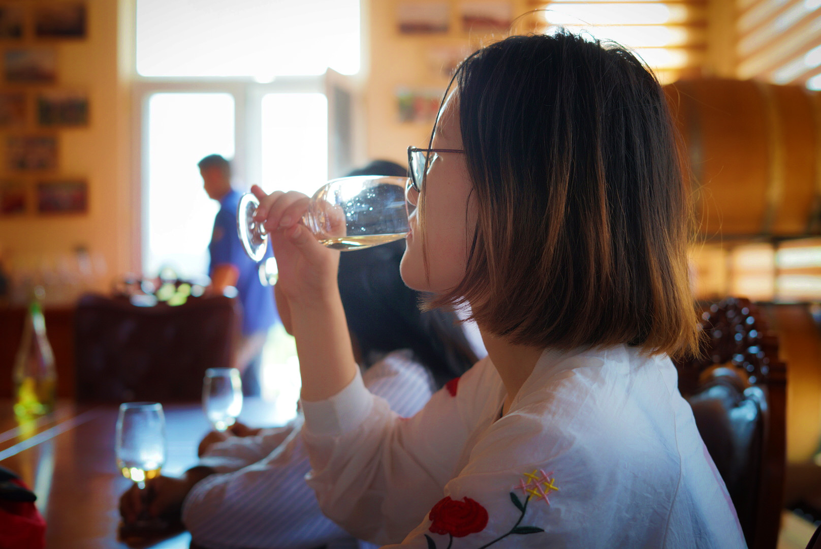 跟着师兄来到了葡萄园旁边一座精致美丽的小屋中,我们品尝了金色时代酒庄中颇具特色的苹果酒和蓝莓酒。就口感而言,苹果酒酸甜爽口,的确非常出色。其间,朱副总来看望我们,给予了我们许多宝贵的经验。“理论只有与实践相结合,才能产生经济效益,这样的人才是人才。”朱副总的话字字珠玑,让我们大学生受益匪浅。