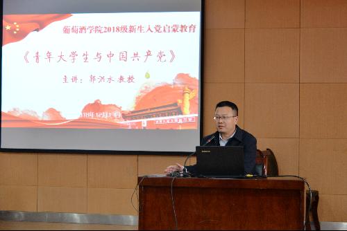 党委邀请马克思主义学院副院长郭洪水教授为2018级本科生、研究生以《青年大学生与中国共产党》为题做大学生入党启蒙教育报告,进一步加深新生对党的认识,提高新生的政治思想觉悟,激发新生对党的信仰和追求。