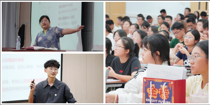 大家庭表示热烈欢迎,祝贺全体同学顺利通过军训这一课,对同学们在训练中展现出的坚强意志和集体精神予以充分肯定。随后,王雅楠以“最美青春的最好遇见——开启大学新篇章”为题,结合辅导员工作经验,围绕大学生涯的思想锤炼、学风建设、素质提升、奖助支持、规划发展、纪律安全、生活指南等方面向新生讲解大学成长之道。她指出,大学是青年学子成长 “拔节孕穗”的关键时期,学习、生活上的困难和挑战在所难免,要勇敢去面对,以坚韧不拔的意志,学会在挫折和孤独中磨练自我、成长蜕变,同时也鼓励同学们主动利用校内丰富的学习发展资源,加强自我管理和时间规划,勤于思考勇于实践,努力实现专业素质与综合能力的“双提升”,奋力书写为中国式现代化挺膺担当的青春篇章。随后,辅导员张世航结合真实案例为同学们细致解读了《第一动漫