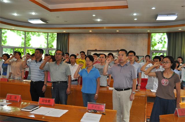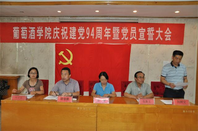 党务秘书钱殷同志领誓,党委书记胡俊鹏、党委委员王华、张振文、刘树文、邓亚丽和27名预备党员、20名正式党员面向鲜红的党旗,庄严地举起右手,向党宣誓,表达了严守誓言、争当优秀共产党员的决心。 预备党员代表刘瑞同志发言,表达了对党的教育和培养的感谢之情,并号召全体党员严格要求自己,不断加强党性修养,在工作、学习、生活中起到模范带头作用。 胡俊鹏书记带领全体党员简要回顾了建党94年来走过的光辉历程和取得的丰功伟绩,总结了现阶段学院党建工作的成果与发展方向。胡俊鹏对全体党员提出要求:一是加强政治理论学习,提升党员理论素质,不断提高学院党建的科学化水平;二是发挥党员模范带头作用,增强党员创新意识,为提升学院中心工作提供强有力的保障;三是加强学院党建,凸显学院特色,有力促进学院事业科学发展;四是积极开展群众路线教育实践活动回头看工作,认真践行“三严三实”,努力实现学院新提升新跨越。他指出,学院全体党员要不断增强对党的事业的责任感,坚定政治信念,铭记党员义务,树立正确的人生观、世界观、价值观,努力实现人生的奋斗目标 最后,大会在《国际歌》歌声中圆满结束。