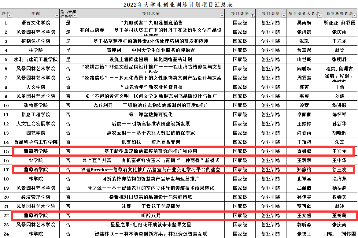 “基于新型禽Ⅳ腺病毒疫苗研究的推广和应用”“酒理Eureka--葡萄酒文化推广品鉴室与产业交汇学习平台的建立”“听醉八月”3个项目被确定为创业训练国家级项目,国家级立项数获历史新高,位居全校前列。
