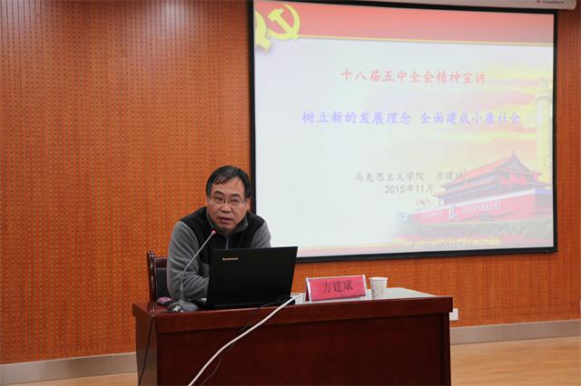 特邀马克思主义学院院长方建斌副教授做十八届五中全会精神宣讲会,全院师生参加学习。报告会由学院党委书记胡俊鹏主持。