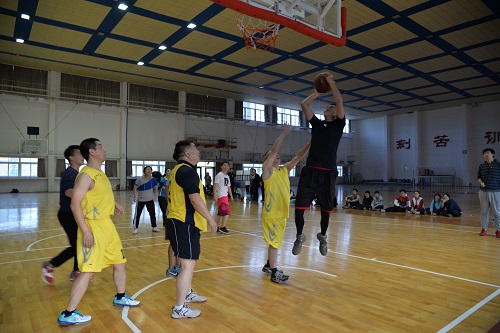 伴随着一声哨响,教师队和学生队展开了激烈的角逐。师生双方抢球、断球、卡位、盖帽,和对手严守硬对、激烈争夺的同时,也不忘与队友默契传球,一次次完美配合,赢得了场下观众的阵阵喝彩声。教师队利用丰富的经验,稳扎稳打,学生队拥有充沛的体力,朝气蓬勃,强强对决,双方丝毫不曾放松,带球突破,挡拆结合,每个动作都帅气利索、针锋相对。最后学生队以42:44的二分之差惜败于教师队,但场上的激烈角逐与场下的声声呐喊会在每位参与者的心上留上浓墨重彩的一笔。