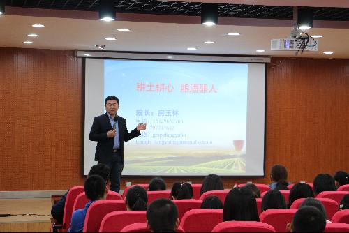 院长房玉林教授在食品大楼六层报告厅为2017级全体新生带来了一场主题为“耕土耕心,酿酒酿人”专业思想教育报告。