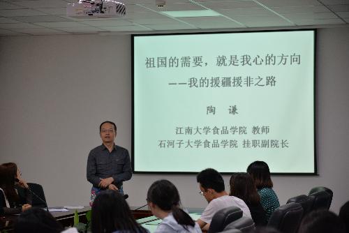 承办的就业大讲堂在学院615会议室举行。江南大学食品学院教师、石河子大学食品学院挂职副院长陶谦老师为同学们带来了“我的援疆援非之路”主题报告会。报告会由学院党委副书记邓亚丽主持,包括学生党员在内的60余名学生聆听报告。