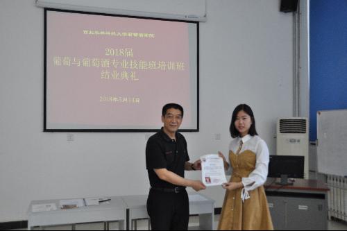 2018年5月14日下午学院举行2018届葡萄与葡萄酒专业技能培训班结业典礼,学院刘树文副院长、班主任张艳芳老师、任课教师靳国杰、科研秘书钱殷及2018届葡萄与葡萄酒专业技能培训班学员参加了结业典礼。