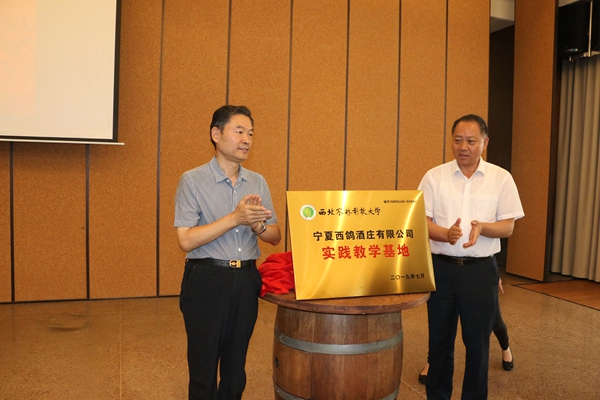 调研期间,在校友张言志庄主的西鸽酒庄还举行了学校校外实践教学基地授牌仪式,李兴旺与曹凯龙共同为基地揭牌。根据协议,双方将从人才培养、科学研究、社会服务等方面加强产、学、研深度合作,助力宁夏葡萄酒产业人才培养和技术进步。