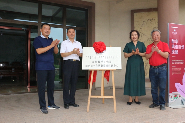 在乌海市阳光田宇国际酒庄,为了感谢李华教授长期对该企业葡萄酒生产的鼎力支持,酒庄专门为李华教授建立了工作室,21日上午,乌海市副市长刘素红、酒庄董事长田旺荣与李兴旺、李华共同为“李华教授工作室阳光田宇自然葡萄酒科研中心”揭牌。调研交流中,刘素红希望能够通过学校的全方位支持,带动当地农民脱贫致富,科学治理沙漠,让乌海市能够和谐、绿色、持续发展,推动沙漠葡萄酒快速走向世界。
