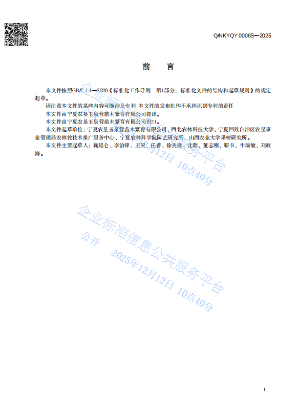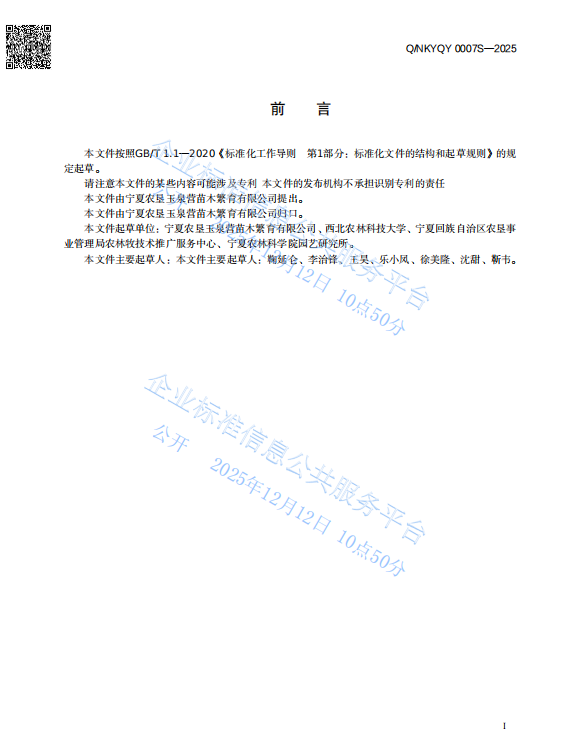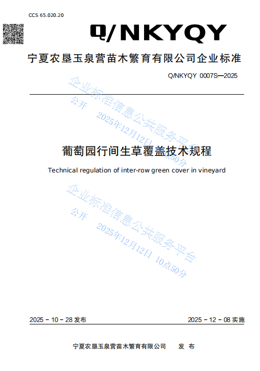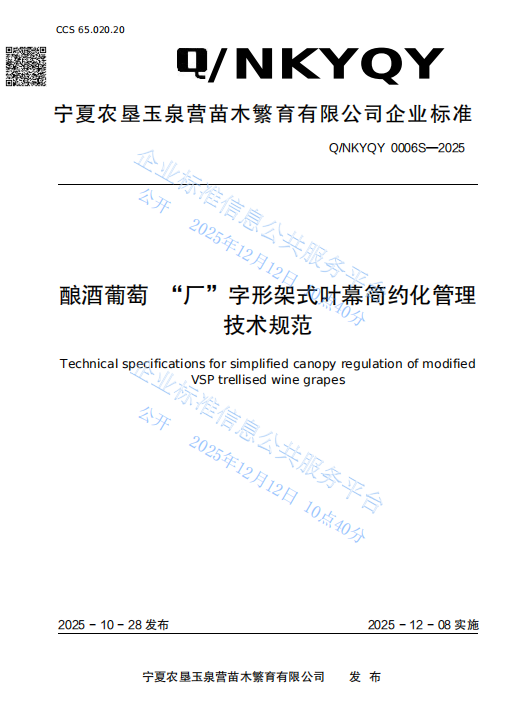 房玉林教授负责的葡萄现代化提质增效栽培技术创新团队深度参与研发,联合宁夏农垦玉泉营苗木繁育有限公司共同制定的《葡萄园行间生草覆盖技术规程》(Q/NKYQY 0007S-2025)与《酿酒葡萄 “厂” 字形架式叶幕简约化管理技术规范》(Q/NKYQY 0006S-2025)两项企业标准正式发布,于2025年12月8日起全面实施。这是团队产学研用融合的重要成果,为宁夏贺兰山东麓酿酒葡萄产业高质量发展提供了精准化、标准化的技术方案。