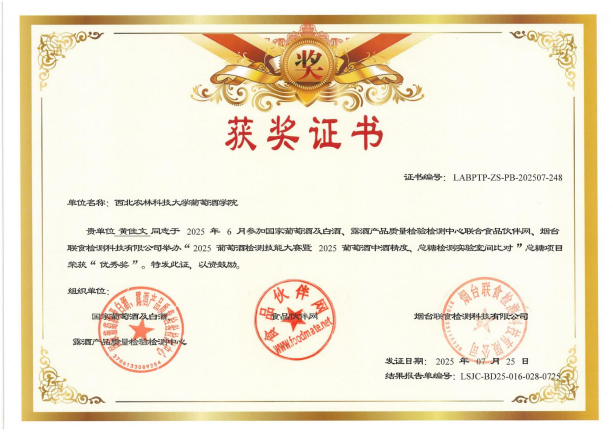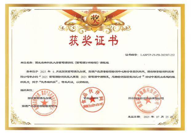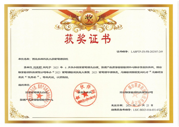 近日,"2025葡萄酒检测技能大赛暨2025葡萄酒中酒精度、总糖检测实验室间比对"活动圆满落幕。学院本科生刘亚莉、侯慧斌、黄佳文三位同学获个人奖项,学院《葡萄酒分析检验》课程组获“优秀组织奖”。